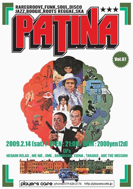 遂に2009年もスタート! 世の中はやれ不況だ何だと言われていますが・・・。 今年もパティーナは昨年の3倍増し?でガンガン行きますよ! 皆さんヨロシクお願い致します。 さて、09年一発目のパティーナはコチラ! ▼▼▼ 2009 02/14(SAT) 21:00start ◎盛岡生音天国◎ [PATINA -パティーナ-] vol.7 -RAREGROOVE,FUNK,SOUL,DISCO BOOGIE,JAZZ,ROOTS REGGEA,SKA- ■DJs NEGAMI RELAX,ABE THE MISSION,NieNie, UME,KEI EBINA,BANGKEAN,TAKAKO ●2000yen [2D] Players Cafe(019-626-2176) http://playersc