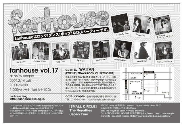 さあ!! 待ちにまった2月14日・・・ といえば!! バレンタインデー!! それだけじゃないっすよ・・・ fanhouseです!!! ■fanhouse vol.17 at 奈良Sample 2009.2.14(sat) 18:00-2:00 1000yen(with 1drink+1CD) Guest DJ: WATTAN(POP UP!) DJs Azuma G-YA(Obscurity Saturday People/FRAGMENT) biff(Raedy for the 80's/BGM) makiko and more... VJ Yoshida Akihiko(BANG BANG) fanhouse blog http://fanhouse.exblog.jp/ fanhouse mixiコミュ