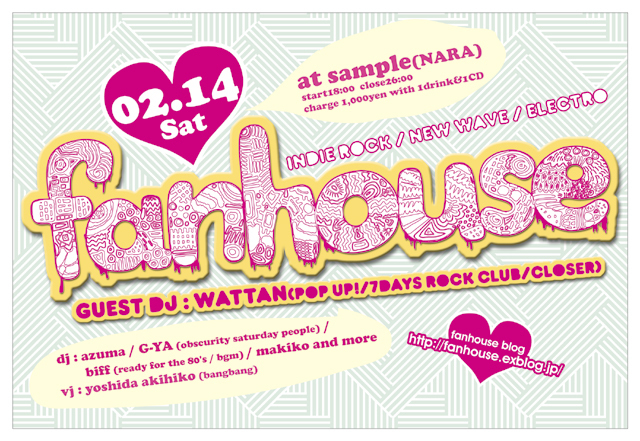 ★fanhouse vol.17 - indie rock/new wave/electro - 2009/02/14(sat) at sample 1F cafe start 18:00 close 26:00 charge 1,000yen(with 1drink&1CD) *Guest DJ WATTAN(POP UP!/7DAYS ROCK CLUB/CLOSER) *DJ Azuma G-YA(Obscurity Saturday People) biff(Raedy for the 80's/BGM) makiko and more... *VJ Yoshida Akihiko(BANG BANG) 09年一発目のファンハウスはバレンタイン大直撃の2・14に開催! カカオ年間消費量ぶっちぎりピークのこの甘ーい記念日(?)にスウィートな名曲の数々、ビターももちろん織り交ぜ、極上の選曲