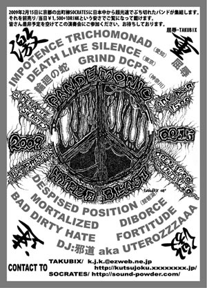 告知失礼致します! 屈辱企画「PANDEMONIC HYPER BLAST」 2009年2月15日に日本中から超光速ブチ切れたバンドが集結します。それを前売り/当日1500円という安さでご覧になって頂けます。 皆さん是非予定を空けて、この演奏会にご参加下さい。お待ちしております! 2/15 ●参加バンド● MORTALIZED(京都) DIBORCE(大阪) FORTITUDE(大阪) BAD DIRTY HATE(大阪) INPOTENCE TORICHOMONAD(愛知) GRIND DCPS(神奈川) DEATH LIKE SILENCE(東京) DESPISED POSITION(琵琶湖) 輪廻ノ蛇(京都)