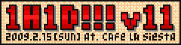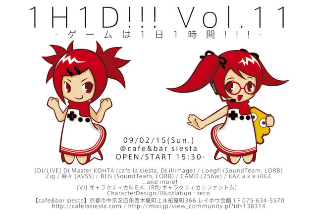 ************************************************** 【1H1D!!! -ゲームは一日一時間!!! - v11】 2009.2/15(sun) open/start 15:30-22:30 at [ cafe la siesta ] http://cafelasiesta.com ************************************************** ◆DJ/LIVE KAZ a.k.a.HIGE Zig 眠々 (AVSS) BEN (SoundTeam, LORB) Longfi (SoundTeam, LORB) DJ マスター航太 (cafe la siesta, DJ illimage) C▲m● (256w) dj p.k.g. ◆VJ ギャラクティカN.E.K. (Rfl/ギャラクティカ☆ファントム) ◆"Controllers" Character Design/Illustlat