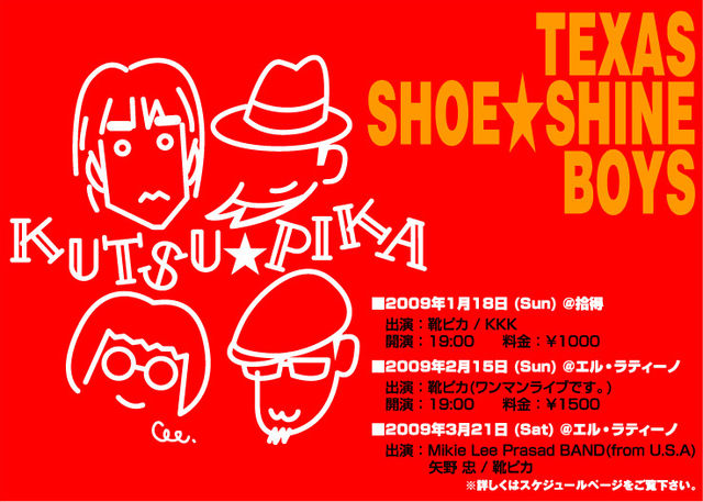 ●2009年2月15日?(Sun) @エル・ラティーノ 出演 : 靴ピカ(guest 河野沙羅) 開演 : 19:00〜 料金 : ¥1500 ※なんと一年ぶりのワンマン・ライブ。ご無沙汰しておりましたぁ。 我が家に帰って、のんびり…たっぷり…ユルユルやりますわよん。 そして、これまたお楽しみ。河野沙羅ちゃんもゲスト参加してくれます。 ●2009年3月21日?(Sat) @エル・ラティーノ 出演 : 矢野 忠 / Mikie Lee Prasad BAND 靴ピカ(guest 河野沙羅) 開演 :
