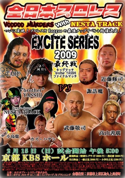 前代未聞!ついにプロレスとレゲエの融合が実現!! 【全日本プロレス】 EXCITE SERIES 2009 最終戦 「タッグマッチ"brother"YASSHIファイナルマッチ」 2月15日(日) 17:00試合開始 @京都KBSホール〔京都市上京区烏丸上長者町〕 前売料金:特別リングサイド(8000円)・指定席(5000円) 当日料金:一般立ち見(3000円)・小学生立見(1500円) 京都のレゲエサウンドNESTA TRACKがBreak timeのホールを乗っ取り、VOODOO MURDERSの応援に…!! 武藤敬司率いる全日本プロレスのそうそうたる面子によるEXCITE SERIES