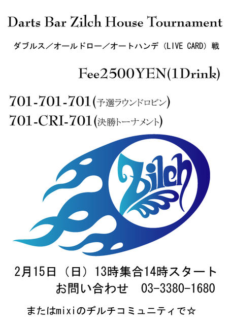 ///////////////////////// 詳細情報お待たせいたしましたー! 2月15日にハウストーナメント開催いたします! ダブルス/オールドロー/オートハンデ戦★ ・最大32名16組による予選ラウンドロビン 《701−701−701》(予定) ・上位2位が決勝トーナメント進出 《701−CRI−701》 ・エントリーフィー2500円(1DRINK付き) ・優勝・準優勝ペアには色々ご用意! 賞品!?というか賞(ry ・当日は500円のキャッシュオンにてドリンク& フードをご用意してお待ちしております☆ オートハンデ戦ですのでダーツライブ