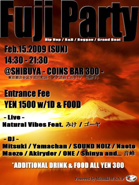 FUJI PARTY @渋谷「COINS BAR 300」 2/15(日曜) 14:30〜21:30 Entrance 1500円(ワンドリンク付&FOOD料込) ※ドリンク&FOOD ALL300円 LIVE Natural Vibes Feat.みけ/ゴーヤ Plastic Panties DJ's Akiryder (R&B・HIPHOP・Reggae) KUPPA (HIPHOP・R&B) 音峰 (R&B・GrandBeat) ONE (HIPHOP・R&B) Shinya (HIPHOP・R&B) SOUND NOIZ (Reggae) Maezo (HIPHOP・R&B) Mitsuki (R&B・HIPHOP) Naoto (HI