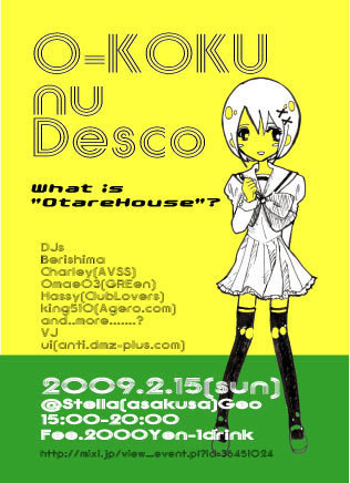 参加費2千円/1D 浅草ステラ http://stella.ne.jp/home.html 2009年始まって最初の王国nuDescoはなんと! ハウス特集!!!!!!!キタコレ! べりしま氏提唱のオタレハウスを軸に、オタクがお洒落なハウスを踊るのか お洒落なオタクがハウスを踊るのか? まぁとりあえずオルガンバンバン!ピアノバンバン! BPMは135以上無し!!!!!アホ踊りも歓迎だ! そして今回は提唱者のべりしま氏が大阪から初Desco!!!! アニメハウス、オタハウスのマストセレクターが放つ MIXは必見よ!! 他にもハウストラ