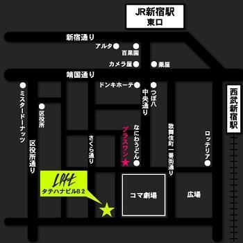 2/16(月) 新宿LOFT 『loft presents“undisputed!!”vol.31』 OPEN 17:30 / START 18:00 ADV ¥2000 / DOOR ¥2500 出演 THE BRIGHT BELLRINGER 処理デキズ ROB☆STAR 未成年 @LOFT http://www.loft-prj.co.jp/LOFT/ http://www.loft-prj.co.jp/i/loft/ 〒160-0021 東京都新宿区歌舞伎町1-12-9 タテハナビルB2 TEL:03-5272-0382 新宿駅東口を出てアルタ向かって左の「百果園」の前、真ん中に街路樹のある道を下る。 靖国通りを越え、歌舞伎町に入り中央通りを直進するとコマ劇場にぶつかる。