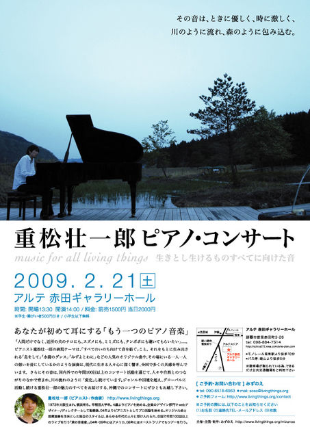 人間だけでなく、生きとし生けるものすべてに向けて音を紡ぐピアニスト重松壮一郎。即興演奏とオリジナル曲による独自の演奏スタイルで国内外にて年間100回以上のライブを行う「旅の音楽家」。その場にいる一人一人の想いを音にしてい