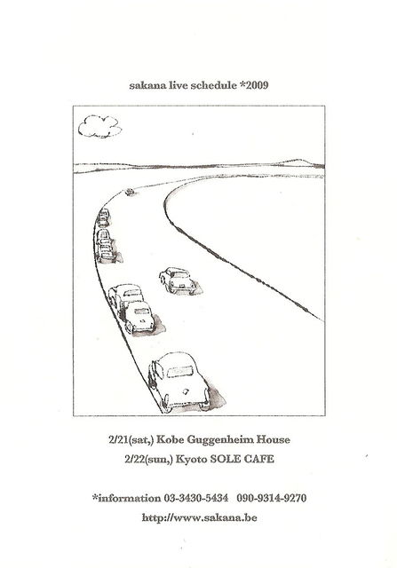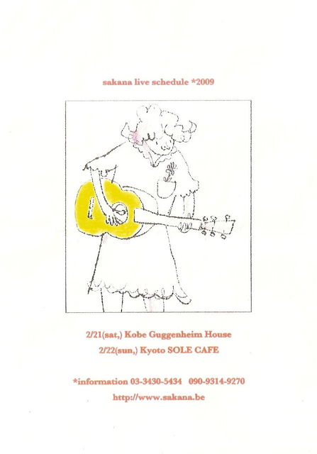 神戸の翌日は京都ですね。 先日のleteのコンサートで共演された滝本さんと 限定45名様とのこと、行ける方は確実に予約を! そして、もし残念ながら予約したけれども行けなくなってしまったことがわかってしまった方は 予約のキャンセルのご協力をお願いいたします。 ---- 「sakana x 滝本晃司 ライブ!」 2月22日(日) 18:00 OPEN / 19:00 START 出演 sakana 、 滝本晃司(ex.たま) 前売御予約¥3000 当日¥3300 (共に1ドリンク別) 限定45名様です。お早い目の御予約をお勧め致します。 チケットの御予約、お問い合わせはSO