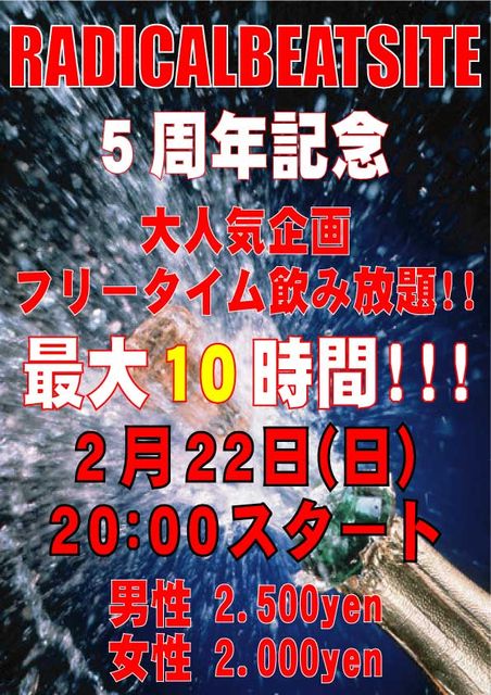 阪急洛西口駅前にBEATがオープンして早くも5年が経とうとしています。 2月28日に木屋町『BOWL』で5周年パーティーを企画していますが、まずその前にホントの周年は『2月23日』なんです!! 明け誕ってコトで、前日の22日かた23日の朝までみんなで飲みまくりたいと思います 詳細はコチラ↓ RADICALBEATSITE5周年記念 大人気企画 『フリータイム飲み放題』 最大10時間の飲み放題!! 男性 2.500円 女性 2.000円 時間の許す限り、飲みまくってください!! 前回、盛り上がり