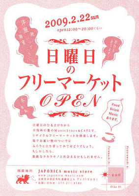 ★☆★☆★☆★☆★☆★☆★☆★☆★☆★☆★☆★☆★☆★☆ 日 曜 日 の フ リ ー マ ー ケ ッ ト 2009.2.22(sun) 12:00~20:00くらい @JAPONICA http://www.japonica-music.com/ ☆☆☆☆☆☆☆☆☆☆☆☆☆☆☆☆☆☆☆☆☆☆☆☆☆☆☆☆ 22日、日曜日のひるさがりから 市役所の裏のMusicStore&CAFEで リサイクルフリーマーケットを開催します。 街でお買い物のついでに ふらりと立ち寄ってみてはどうでしょう。 もしかしたら、 素敵なタカラモノと出会えるかもしれません。 ★☆★☆★