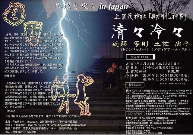 地球を吹く in japan 上加茂神社 「御阿札神事」 清々冷々 近藤等則 土佐尚子 ライブ日程 2009年2月21日(土)22日(日) 両日とも 17時にお集まりください。 上加茂神社 「本殿前」 入場料 室内¥5,000(限定40名) 屋外¥2,000(限定60名) お申し込み お早めにお申し込みください。 こちらのHPでも申し込めます。 http://www.tosa.media.kyoto-u.ac.jp/kamigamo/index.html ジャズクエスト 電話075‐255‐0747 1月