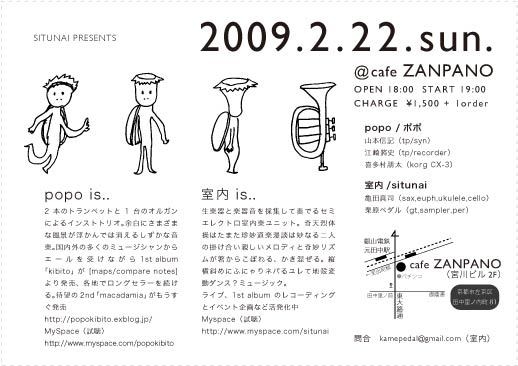2月22日(日)@cafe ZANPANO ■cafe ZANPANO おいしい珈琲とおいしい西洋料理の店です ・丁寧に焙煎された新鮮な豆を使っています ・マスターにいやんの食へのこだわりは音楽のようです 京都市左京区田中里ノ内町81宮川ビル2F (叡山電鉄元田中駅からスグ) こんなステキな場所でステキなライブします 脳みそが解放されること間違いなしです リラックスしにきてください 出演: popo 山本信記 (トランペット/シンセサイザー) 江崎將史 (トランペット/リコーダー) 喜多村朋太 (オルガン)