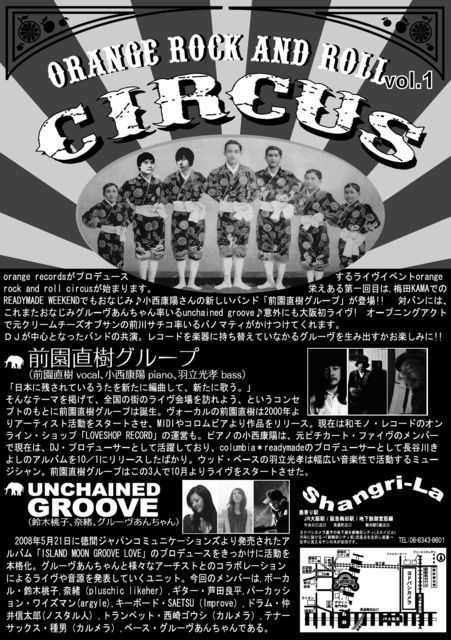 栄えある第一回目は、梅田KARMAでのREADYMADE WEEKENDでもおなじみ♪小西康陽さんの新しいバンド「前園直樹グループ」が登場!!対バンには、これまたおなじみグルーヴあんちゃん率いるunchained groove♪以外にも大阪初ライヴ!