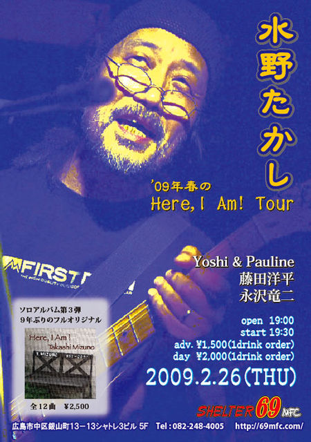 場所■SHELTER 69 MFC 広島市中区銀山町13-13 シャトレ3 5F TEL/082-248-4005 http://www.69mfc.com/ 開場■19:00 開演■19:30 前売■\1,500+1Drink 当日■\2,000+1Drink 《出演》 ○水野たかし(from東京) ○Yoshi & Pauline ○藤田洋平 ○永沢竜二 http://www.geocities.co.jp/MusicStar-Guitar/2683/profile1.html