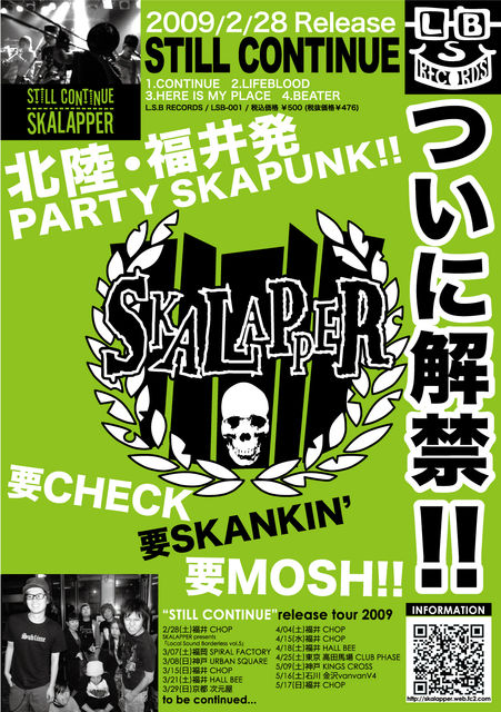 福井を代表するPARTY SKAPUNKバンド『SKALAPPER』 『L.S.B RECORDS』より、2月28日にリリース予定『STILL CONTINUE』と同時に『LOCAL SOUND BORDERLESS vol.5』を控えている。 そのリリース&レコ発PARTYを直前にゲスト出演決定!!! 新メンバーが増えてからのレックやイベントの事・・・色々とたっぷり話聞きたいねーww 豪華プレゼントあり!!!・・・かもね?(笑) この日は『リリース前夜祭』でっせー!!会場に駆けつけて下さ