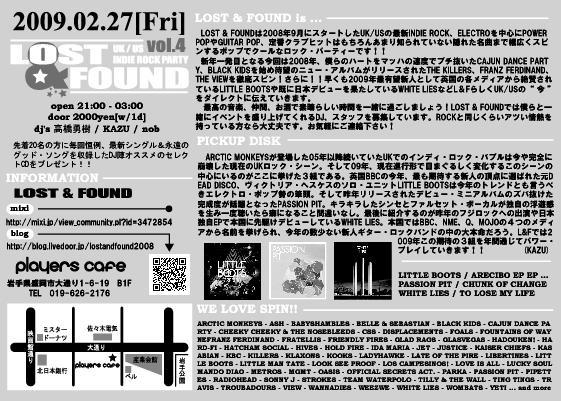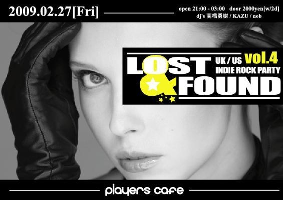 LOST & FOUND vol.4 2009/02/27[Fri]@players cafe OPEN 21:00-/DOOR 2000yen[w/2D] ☆先着20名様にDJ陣オススメの最新シングル&永遠のグッド・ソングを 収録したセレクトCD-Rをプレゼント!! DJs 高橋勇樹 / KAZU / nob よろしくお願いします☆