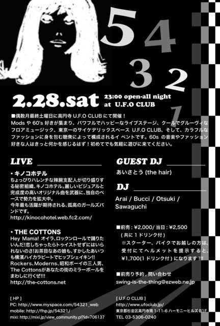 今年一回目は、巷の話題独占貫禄十分のガールズバンド・キノコホテル、只今人気急上昇中の若手ロックンロールバンド・Cottons、そして、ゲストDJに東京モッズシーン黎明期から活躍するthe hairのあいさとう氏を迎えて、対するレギュラーDJ陣もより一層の意気込みで、華々しく開演します!!!