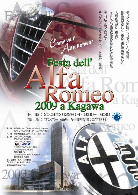 アルファロメオ・オーナー様同士のコミュニケーション、情報交換を目的とした手作りオーナーズミーティング”Festa dell'Alfa Romeo 2009 a Kagawa“を香川県高松市のサンポート高松で開催します。お話をするも良し、観光・散策をするも良し、さぬきうどんを食べに来るついででも良し。桜の開花も迫ろうとするドライブシーズンが到来する春。お気軽に参加してください。