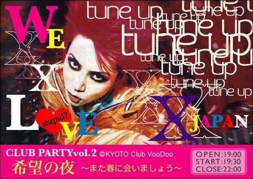 イベント名【『希望の夜』また春に会いましょうParty!】 会 場:京都/木屋町(阪急河原町駅より徒歩8分程度) DJ BAR VooDoo http://bar-voodoo.jp/index.html 【会場への行き方】http://bar-voodoo.jp/access.html 時 間:OPEN 19:00 / START 19:30 / END22:00 料 金:¥4,000 (ドリンク飲み放題) ※再入場可能です。 ☆DJ:Ryuichiさんです! ☆好きなとこにhideちゃんを描いてくれるボディペント師匠!キセツちゃんも参加! ☆VJ:暴れん坊怪獣! Yas! 【どんなイベント?】 hide/zilchをメインにXやhideゆか