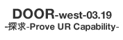 DOOR2009 -west- KYOTO 03.19 http://door.no-proof.org ----------------------------- ...In no-proof.Lab, given theme is [扉-door-]. 結婚、出産、起業、入学、就職、旅、発見、決意… 人にはそれぞれの『扉』を得る機会があります。 仮説 "『扉』って、人と人との出会いによって生まれるんちゃうん?" 仮説 "『扉』が生まれる出会いには、互いに心開いてないと無理よねー" そんな軽々しい仮説を、検証させていただきたいと思います。 私たち自身が『扉』を生むことのできる可能性は? そして、『扉』が生まれることによ