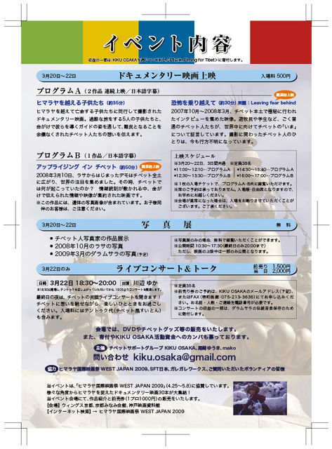 ------------------------------------------------------- 2008年3月10日、あれから1年 ―― 今、チベットで何が起きているのか チベット人は何を思うのか 知ってください、本当のチベットのこと ------------------------------------------------------- 日時:3月20日(祝)・21日(土)・22日(日) 場所:堺町画廊 住所:京都市中京区堺町通御池下ル 電話&FAX:075-213-3636 アクセス:地下鉄「烏丸御池」駅から徒歩5分 阪急「烏丸」または地下鉄「京都市役所前」駅から徒歩8分 阪急「河原町」駅か