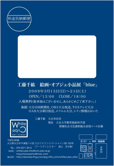 告知失礼いたします。 アートスペースホワイトキューブより、次回企画のお知らせです。 工藤千紘 絵画・オブジェ小品展「blue」 2009年3月15日(日)〜21日(土)全7日間 OPEN/13:00〜18:00 入場無料 駐車場/なし 後援:大分合同新聞社 OBS大分放送 TOSテレビ大分 OAB大分朝日放送 エフエム大分 シティ情報おおいた アートスペースホワイトキューブにおける久しぶりの企画は、大分在住で美術を学んでいる大学生工藤千紘さんによる作品展「blue」です。 (相生町の呑み屋「ばじ」のアルバイトのちーち