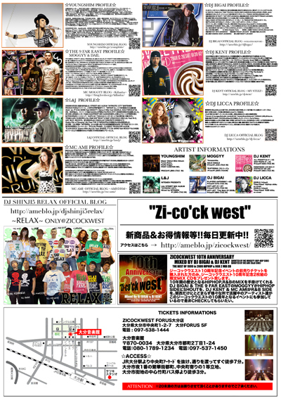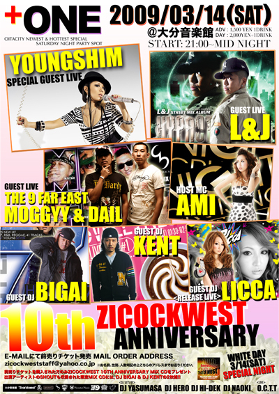 大分もYOUNGSHIM初LIVEします!! 九州での初上陸です。 楽しみましょう!! "(+ONE)プラスワン zicockwest 10TH ANNIVERSARY" 3/14(土)@大分音楽館 【OPEN/START】21:00〜 【出演】 THE 9 FAR EAST(MOGGYY&DAIL)/YOUNGSHIM/ L&J/DJ BIGAI/DJ KENT/DJ LICCA/AMI DJ:DJ YASUMASA/DJ HERO/DJ HI-DEK/DJ NAOKI LIVE:O.C.T.T 【チケット料金】前売¥1,500/当日¥2,000 大分フォーラスのZICOCKWESTでチケット販売中 ※前売りを買われた方のみ10TH ANNIVERSARY限定の2枚組MIX CDをプレゼント ●10TH ANNIVERSARY 2枚組MIX CD 1999年か