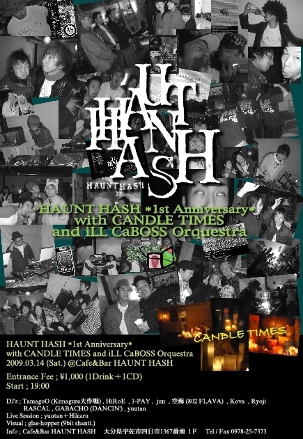 昨年3月、宇佐市四日市にOpenしたHAUNT HASH。 早いもので今月の17日でHASHも1周年を迎えます!! 日ごろお世話になっている方たちに感謝の気持ちをイベントという形で贈ります。 お越し下さった方全員が楽しめるようスタッフ一同頑張ります☆ 是非いらして下さい! 詳細はこちらです♪ ↓↓↓ とうとうHAUNT HASHも1周年を迎えます。 支えて頂いた皆さん・・・ ありがとう その気持ちを込めてのEvent・・・ HAUNT HASH*1st Anniversary* with CANDLE TIMES and iLL CaBOSS Or