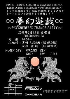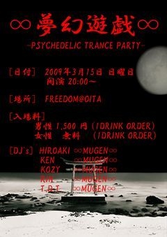 ∞夢幻遊戯∞ -PSYCHEDELIC TRANCE PARTY- [日付]2009年3月15日 日曜日 [場所]FREEDOM@OITA [入場料]男性1,500円 (1 DRINK ORDER) 女性 無料 (1 DRINK ORDER) [DJ's] HIROAKI ∞MUGEN∞ KEN ∞MUGEN∞ KOZY ∞MUGEN∞ RIN ∞MUGEN∞ T.D.T. ∞MUGEN∞ 九州が誇る大箱PSYCHEDELICの最激戦区BOND FUKUOKAにてPSYCHEDELIC DJのトップに君臨していたDJ HIROAKIがここ大分をホームに置いて2009年3月15日より始動!!! 気軽にメッセやマイミク下さい*´∀`*