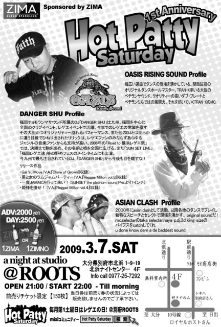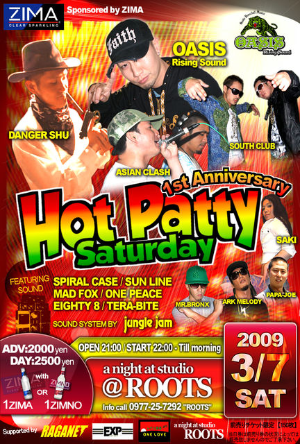 「Hot Patty Saturday 1st Anniversary」 2009.3.7 SAT @ROOTS 大分県別府市北浜 1-9-19 北浜ナイトセンター4F info call 0977-25-7292 おかげ様でホッパも1周年!って事で3月の第1土曜日はいつも以上にスペシャルで危険で過激な夜になる事間違いない! レゲエ激戦区、大阪からOASIS Rising SoundがHot Pattyに初登場!!! ◆前売りチケット、限定150枚!絶賛発売中! Don't miss it!!! special guest sound OASIS Rising Sound - from OSAKA special guest deejay DANGER SHU guest sound ASIAN CLASH guest