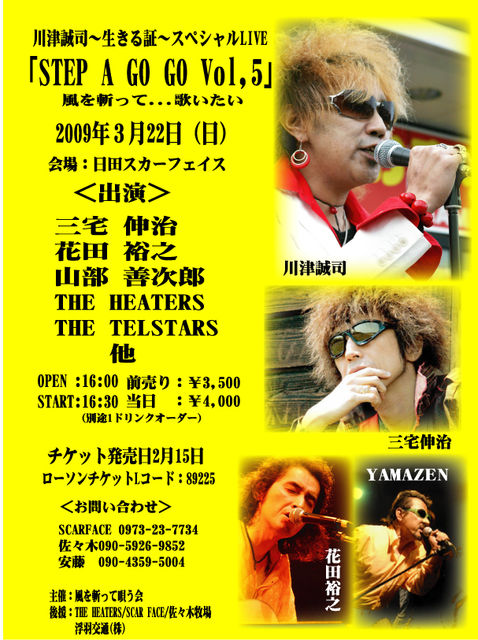川津誠司〜生きる証〜チャリティーLIVE 「STEP A GO GO Vol,5」 風を斬って・・・歌いたい 2009年3月22日(日) @日田スカーフェイス 料金:¥3,000 OPEN:16:00 START:16:30 <出演> ★三宅伸治 ★花田裕之 ★山部善次郎 ★THE HEATERS ★THE TELSTARS 他 <チケット発売日> 2月15日 <チケット購入方法> ローソンチケット Lコード:89225 限定200枚となっております。 ※このLIVEの収益金はゲストバンドさんに お支払いするギャラ以外は全て川津誠司に贈ります!! ------------------------