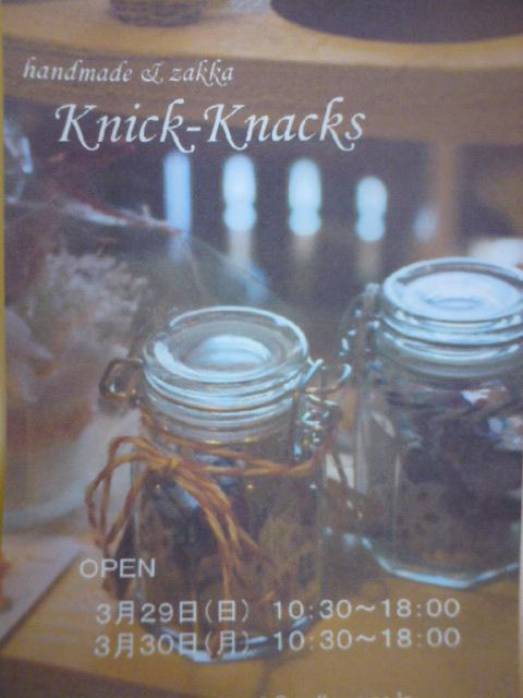 2day shop 開催のお知らせです♪ * shop * Knick-Knacks(ニックナックス) * 場所 * 大分県日田市高瀬本町(高瀬小学校近く) * 日時 * 2009年 3月29日(日)10:30〜18:00 ・30日(月)10:30〜18:00 おかげさまで今回で5回目の開催になります♪ handmade品、雑貨、パン&お菓子などなど たくさんの素敵なものをご用意しています♪ パン&お菓子は二日間ともご用意しておりますが、 おかげさまで毎回大好評をいただいており 午前中で品薄になってしまうことも ございますのでご了承