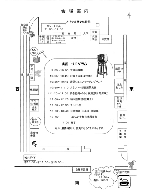第4回 きよはら飛山まつり 日時:平成21年 3月14日(土) (雨天順延)15日 午前9:30〜午後2:00 会場:飛山城史跡公園(国指定史跡) のろし実演、武者行列、模擬店等 演芸 プログラム 09:55〜10:05 太陽幼稚園 10:05〜10:20 お囃子演奏(2団体) 10:25〜10:45 清原ジュニアマーチングバンド 10:50〜11:10 よさこい清原支部 11:20〜12:00 武者行列・のろし実演(多目的広場) 12:00〜12:25 和太鼓集団(鼓武士) 12:30〜12:55 チンドン屋 13:00〜13:40 日本舞踊(三喜流・雅初会) 13:45〜   よ