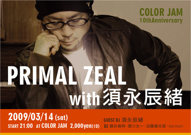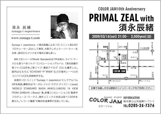 管理人様、告知失礼致します。不適切でしたら削除お願い致します。 COLOR JAM 10th Anniversary 『PRIMAL ZEAL with 須永辰緒』 2009年3月14日(土) START 21:00〜 \2000(1D) GUEST DJ 須永辰緒(sunaga t experience) DJ 鍋谷倫明   斎川太一   加藤健太郎   darman ※お車でお越しの方は駅前のコインパーキングをご利用下さい。 COLOR JAM 栃木県小山市城東1-11-1 0285-24-7376