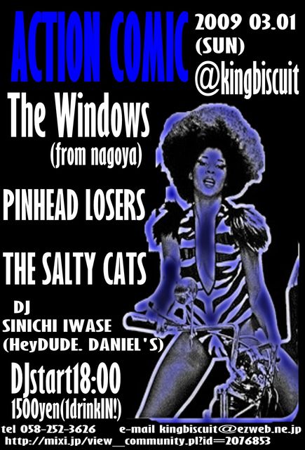 <<<ACTION COMIC>>> 2009 03.01(SUN) @gifu kingbiscuit band The Windows(nagoya) http://www.myspace.com/thewindows1965 PINHEAD LOSERS http://www014.upp.so-net.ne.jp/pinheadlosers/ THE SALTY CATS http://www.salty-cats.com/pc/index.html dj SINICHI IWASE(Hey☆Dude DANIEL'S) DjStart18:00 \1500(1drinkIN!)