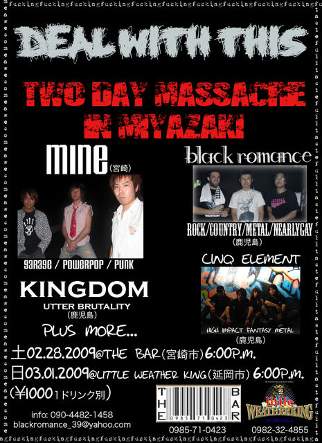 どうもどうも ブラックロマンスです.こんどの日曜日にlittle weather kingでライブをします。鹿児島と宮崎のバンドがやります。このライブはへヴィーセクシャル。ぜひぜひ来て下さい。