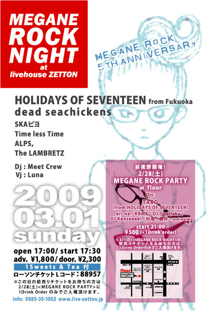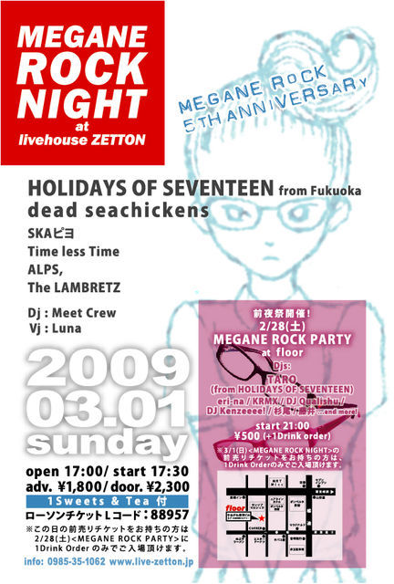 The LAMBRETZ出演します! 3/1(日) 〈 MEGANE ROCK NIGHT 5th Anniversary 〉 at LIVEHOUSE ZETTON ■open/start 17:00/17:30 ■adv/door \1,800/\2,300 (1sweets&tea付き) Lコード:88957 ※この日の前売りチケットをお持ちの方は、2/28(土)〈 MEGANE ROCK PARTY 〉@floorに1drink orderのみでご入場頂けます。 ‐BANDS‐ dead seachickens HOLIDAYS OF SEVENTEEN (福岡) ★SKAピヨ!!★ Time less Time ALPS, The LAMBRETZ ‐VJ‐ luna ‐DJ‐ MEET CREW ‐ART