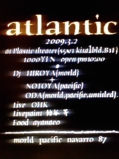お久しぶりです。 最近、Oiseauはメンバーの都合でなかなか活動できませんが 4月には久々のライブ予定があります。今年もがんばります。 さて、そんな中、Oiseau Crewの課外活動はいろいろ入っています。 今回はOiseauからkei(ピアニカetcメロディ担当)、ham(パーカッション)と、トラックメイカーのODA氏が組んだDUBユニット「Ohk(オーク)」のライブ。 Oiseau活動当初からセッションしている絵描き、等のライブペイントもあります。 --------------------------------------------------------------------- 「atlantic」 200