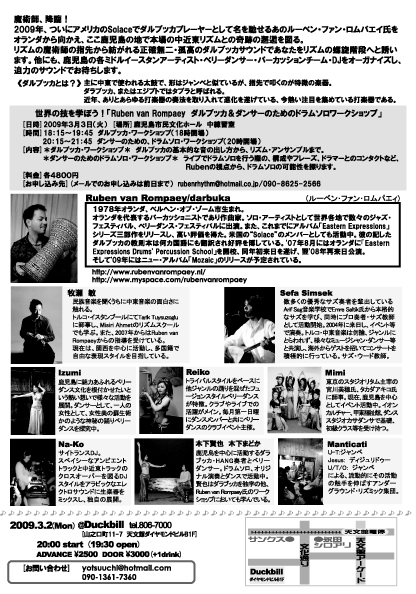 Disco 零夜 無事終了し、本日! オイラが! プロデュースするeventをやります! お時間・興味がある方! 遊びにお越し下さい! SPECIAL GUEST : Ruben van Rompaey GUEST sefa simsek サズ、ウード奏者 牧瀬 敏 IZUMI Reiko Mimi 木下賢也 木下まどか NA-ko manticati 会場→ Duck bill open 19:30〜 start 20:00〜 ADVANCE \2500 (+1drink) DOOR \3000 (+1drink) ★お問い合わせ mail yotsuuchi@hotma