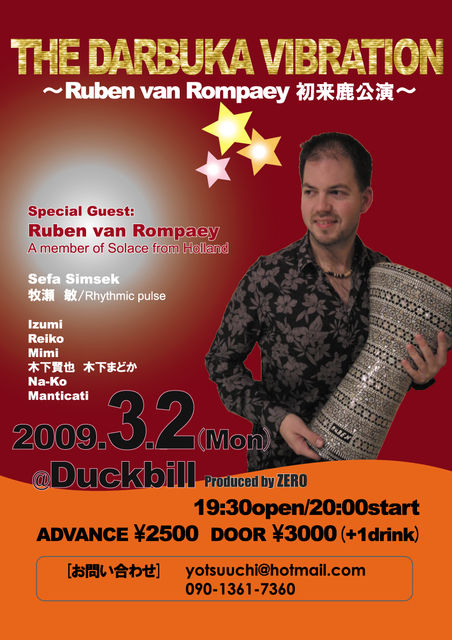 告知失礼いたします♪ 世界で活躍するルーベン・ファン・ロムパエイさん(ダルブッカ)がオランダから初来鹿します! 京都から牧瀬敏さん(ダルブッカ)、セファーさん(サズ・ウード)と鹿児島で活躍するベリーダンサー、ジャンベ、ディジュ、ダルブッカプレイヤーたちとのコラボ共演です! 後半はセッションタイムで、ジャムります♪ そして生音で皆で踊りましょう 平日ですが、後悔はさせません(笑) 世界の技をぜひ見てください♪ SPECIAL GUEST : Ruben van Rompaey GUEST : sefa simsek