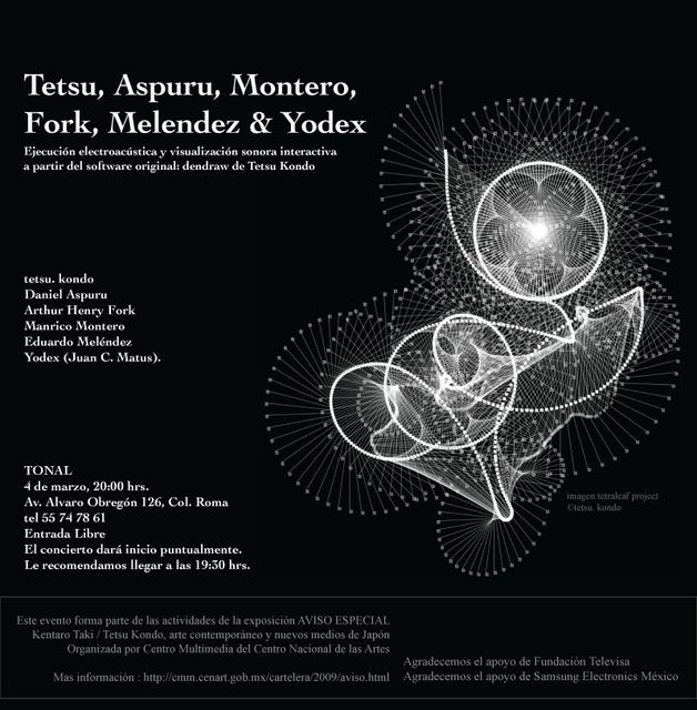メキシコシティのCentro Nacional de las Artesのマルチメディアセンターにてビデオ作家の瀧健太郎さん、コンピュータープログラミングと音を使ったマルチメディアアート作家の近藤テツさんを迎えての講演会、展覧会、パフォーマンス、ワークショップが行われます。