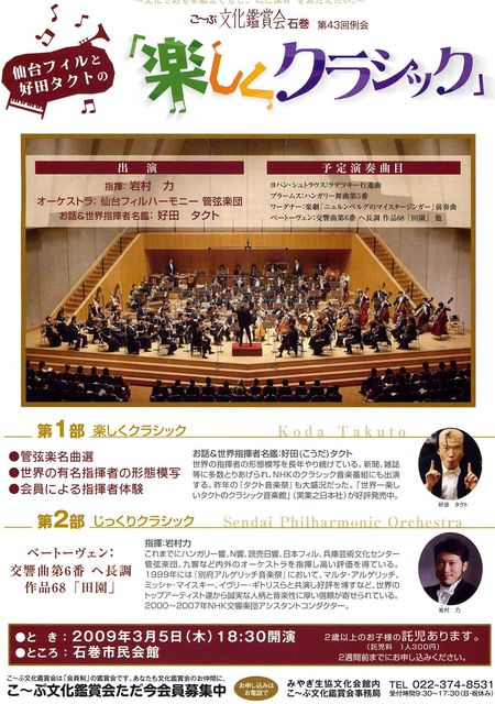 3月5日に仙台フィルと共演します。 場所は石巻市民会館です。 楽しいコンサートになりますように。 午後6時半開演です。 下記はそのチラシです。 第2部では岩村力さん指揮で、ベート−ヴェン交響曲第6番「田園」の全曲演奏があります。