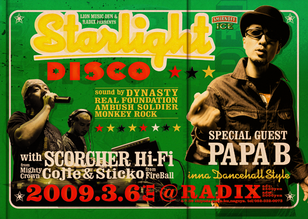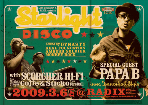 「STARLIGHT REGGAE FESTA in 明宝’08」で、音楽の森をわかせた「STARLIGHT DISCO」が毎月第一金曜日にRADIXで開催決定!!!なんと、40歳以上は入場無料!!!