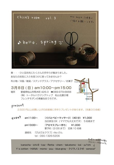 3月8日(日) 松山市馬木のトータルハウジングトップにて 3回目の1day syopを開催します 春をさがしにきませんか? 詳細はこちらまで http://yaplog.jp/nanatone/archive/269