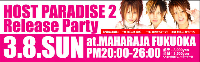 £³·î£¸Æü¤ÎÆüÍËÆü¡¢ Ãæ½§¤Î¥²¡¼¥Ä¥Ó¥ë£¶£Æ£Í£Á£È£Á£Ò£Á£Ê£Ù£Á£Æ£Õ£Ë£Õ£Ï£Ë£Á¤Ë¤Æ ¥Û¥¹¥Ñ¥é£²¥ê¥ê¡¼¥¹¥Ñ¡¼¥Æ¥£¤ò³«ºÅ¤·¤Þ¤¹ ¥Û¥¹¥È¥Ñ¥é¥À¥¤¥¹£² ¥ê¥ê¡¼¥¹¥Ñ¡¼¥Æ¥£ 3.8.SUN¡¡PM20:00¡ÁPM26:00 MAHARAJYA FUKUOKA Á°Çä¡¡3,000en ÅöÆü¡¡3,500en *Æþ¾ì»þÊÌÅӥɥê¥ó¥¯¥ª¡¼¥À¡¼À© SPECIAL GUEST ±«Î®¡¡·õ»ù Í¥»Î °ì¾ò¡¡À¿ Ãæ½§¤Î¥¤¥±¥á¥ó¥Û¥¹¥ÈÂ罸¹ç °ìÌë¸Â¤ê¤Î¥¤¥±¥á¥ó¥Ñ¥é¥À¥¤¥¹ ¥Û¥¹¥È¥¯¥é¥Ö¤ò¥Õ¥å¡¼¥Á¥ã¡¼¤·¤¿¿Íµ¤¥³¥ó