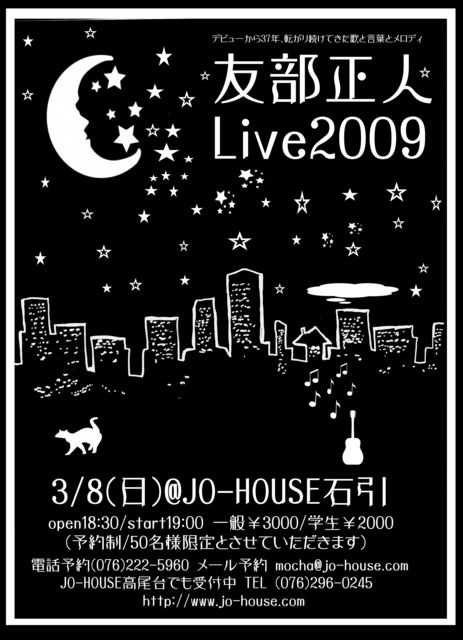 友部正人LIVE 3/8(日)@JO-HOUSE石引 open18:30/start19:00 一般¥3000/学生¥2000 (予約制/50名様限定) 電話予約JO-HOUSE石引 (076)222-5960 メール予約 mocha@jo-house.com <JO-HOUSEへのアクセス方法> 金沢駅西口のバス乗り場から出ている緑色のプレート No.10、11、12,13,14,15,16 のいずれかのバスに乗って 「小立野(こだつの)」という停留所で下車。 そのままバスの進行方向に数十歩、 ヤマザキデイリーストアさんの真正面、 おでん屋「若葉」さんの真横のビルがJO-HOUSEです。 http://www.jo-hou