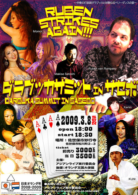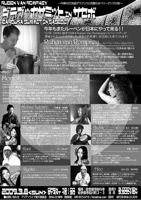 2007年、2008年に続き、この2009年3月にオランダより世界的に有名な 凄腕中東打楽器奏者、Ruben van Rompaey氏が来日します。 今年は東京・名古屋・大阪・京都・鹿児島・佐世保と各地でライブとワークショップが開催されます。 3月8日(日)に佐世保市妙行寺にてベリーダンスライブを行います。 昨年に続き2回目となる佐世保市でのライブは、合宿WS併催ということもあり、 国内よりトップレベルのダラブッカ奏者もライブへ多数参加。 合宿WS参加者全員によるパフォーマンスも見物です。 ダンサー陣には福岡のmomoiベリーダンス