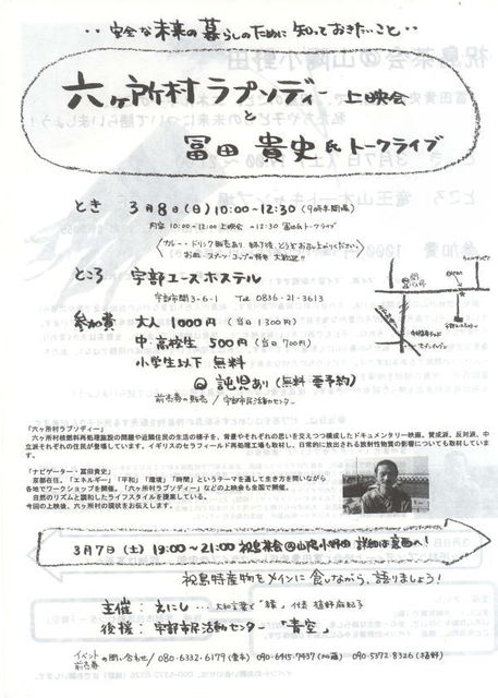 2009/3/8 六ヶ所村ラプソディー上映会と冨田貴史氏トークライブ <託児あり・無料 要予約> と き 2009年3月8日(日)10時〜12時半 (9時半開場) ところ 宇部ユースホステル 参加料 大人1000円(当日1300円) 中・高校生500円(当日700円) 小学生は無料 前売り券販売:宇部市民活動センター 0836-36-9555 内容 10:00〜12:00 上映会 〜12:30 冨田氏トークライブ <カレー・ドリンク販売あり 終了後、どうぞお召し上がりください> 「六ヶ所村ラプソディー」 六ヶ所村核燃料