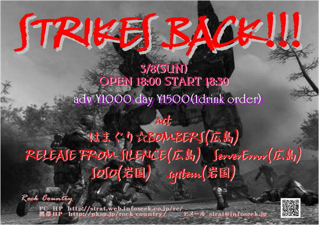 『STRIKES BACK!!!』 広島から活きのイイバンドが3バンド来襲!!! ロッカン初参戦の2バンドに加えて、ロッカンでもお馴染み、はまぐり☆BOMBERSが今回も暴れてくれます! 勿論、岩国バンドも熱い勢いでガツンと迎え撃ちます!!! 盛り上がる事間違いなし! おもいっきり楽しみたいなら来るしかないでしょう! act ★RELEASE FROM SILENCE(広島) ★ServerError(広島) ★はまぐり☆BOMBERS(広島) ★SOSO(岩国) ★system(岩国) OPEN 18:00 START 18:30 adv \1000 day \1500(1drink order)
